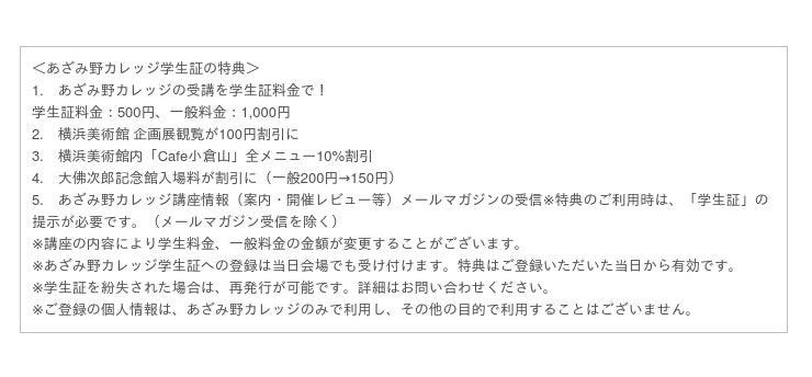 [学生証]あざみ野カレッジ学生証あざみ野カレッジの受講には、学生登録をお勧めします(登録無料)。登録当日から学生料金で講座に参加できます。「あざみ野カレッジ学生証」登録をご希望の方は講座のホームページ申し込みフォーム、もしくは講座開催当日受付にてご登録ください。