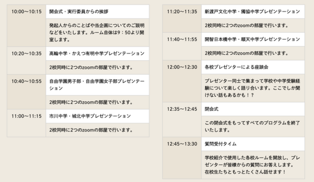 内容: オンライン上での学校説明会(1校あたり15分のプレゼン、30分の座談会、自由参加の質問受付タイム)