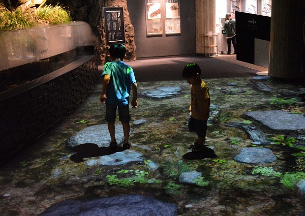映像が映し出されるエリアを昨年の1.5倍の広さに拡張し、床一面に何頭ものオオサンショウウオが足元を「ぬめぬめ」と動くようすのほか、新たに水面で息継ぎをする姿や大きな口を開けてあくびをする姿など迫力あるシーンを追加しました。自然の中でオオサンショウウオに出会うかのような感覚を体験することができます。