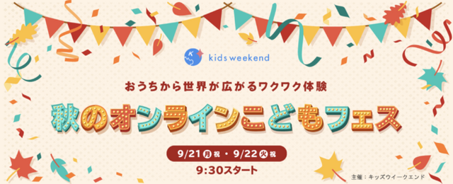 子ども向け「教育×オンライン」の分野では、日本最大級のプラットフォームである「キッズウィークエンド」を運営するキッズシーズ株式会社(本社:東京都中央区、代表取締役:三浦里江)は、9月21日(月)~9月22日(火)のシルバーウィーク期間中、未就学児から小学生の子どもたちに向けた「秋のオンラインこどもフェス2020」を開催します。
