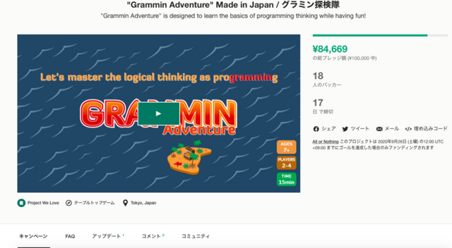 グラミン合同会社(本社:東京都世田谷区)は、2020年8月27日に、おうちで学べるプログラミング・ボードゲーム「グラミン探検隊」英語版開発の資金調達をkickstarter上で開始いたしました。英語版のリリースは2021年春を予定しており、プログラミング教育への関心がたまっているアジア圏、欧米などを中心に販売をスタートさせる予定です。