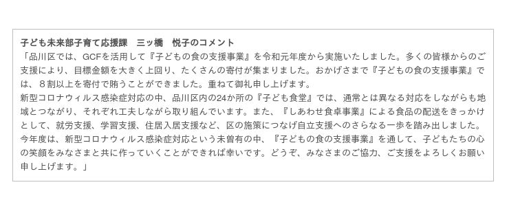 東京都品川区とふるさと納税総合サイト「ふるさとチョイス」を企画・運営する株式会社トラストバンク(本社:東京都目黒区、代表取締役:川村憲一、以下「トラストバンク」)は9月10日、トラストバンクが提供する、クラウドファンディング型でふるさと納税を募る仕組み「ガバメントクラウドファンディング(R)」(以下GCF)で、子どもの食の支援事業を目的としたプロジェクトを開始します。募集期間は2020年9月10日~12月31日、目標寄付金額は500万円です。