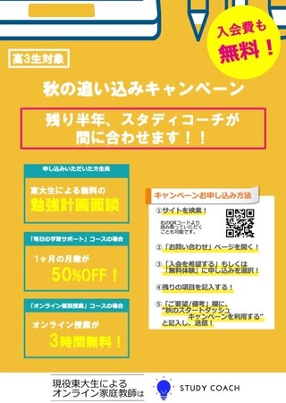 株式会社Builds(本社:東京都港区、代表取締役社長:橋本竜一)が運営する家庭教師サービスであるスタディコーチは、高3生向けの秋の追い込みキャンペーンを開始いたしました。スタディコーチでは受験まであと半年を切った高3生に向けて、受験までの追い込みを全力でサポートいたします!