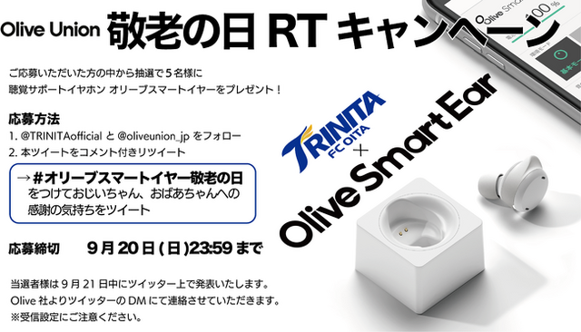 敬老の日リツイートキャンペーンにご参加いただいた方の中の方から抽選で5名様にOlive Smart Ear(オリーブスマートイヤー)をプレゼントします。