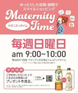開店前の9:00~10:00までの間、『マタニティTime』として、マタニティの方限定のショッピングタイムとします。予約されたお客さまのみ入店が可能です。おひとりおひとりに合わせた接客が必要かどうかも事前に入力いただき、当日のご案内をさせていただきます。「出産前にお買物に行きたいけれど、混雑したお店に出掛けたくない」、「ゆったりした空間・時間でお買物したい」という声にお応えして、マタニティタイムを設けました(要予約・無料)。ぜひ、ご活用ください。(一般のお客さまは10:00からの入店となります。)