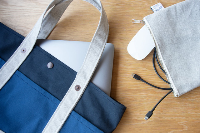 メディアにも取り上げられ、タケヤリでも大人気のトートバッグ。今回は新たにネイビーが定番色に追加されます。すでにある優しいベージュとは、がらりと雰囲気を変えたシックなネイビーの生地が特徴的。