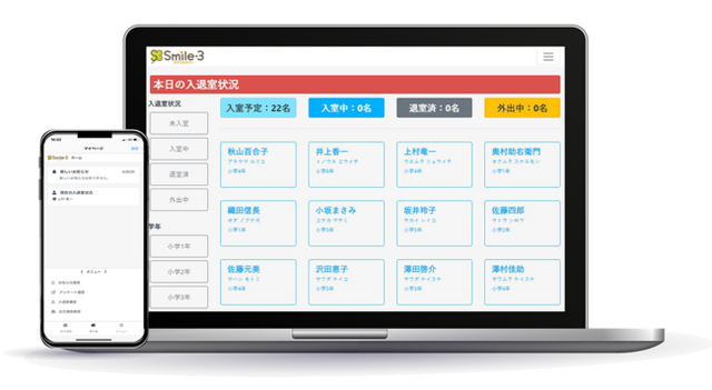 このような事態を防ぐため、現場の業務効率化を目的とした管理システム「Smile-3」を開発しました。支援員は専用アプリを通じて、保護者から欠席・遅刻の連絡や児童の健康状態などを個別に受信できるほか、入退室管理やイベント告知、アンケートの一斉配信の機能も利用できます。