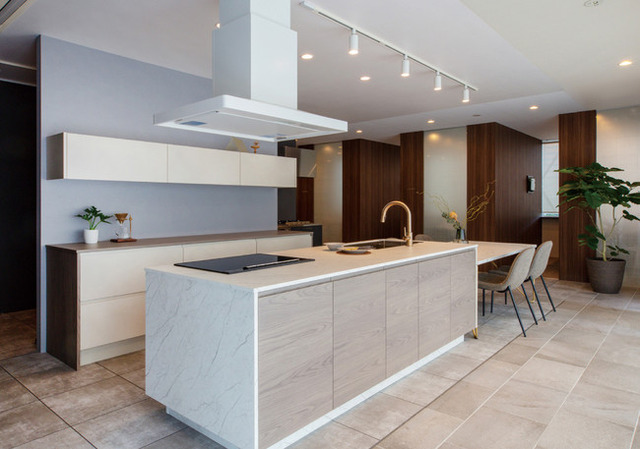 中央のキッチンでは、白の石目柄とグレイッシュな木目柄の面材コンビネーションに、ゴールドのシンクと水栓金具をアクセントとしてあしらい、シックでエレガントな新しい上質のかたちを表現しています。BOSCHをはじめとする洗練されたデザインの高性能機器を採用している点も魅力です。