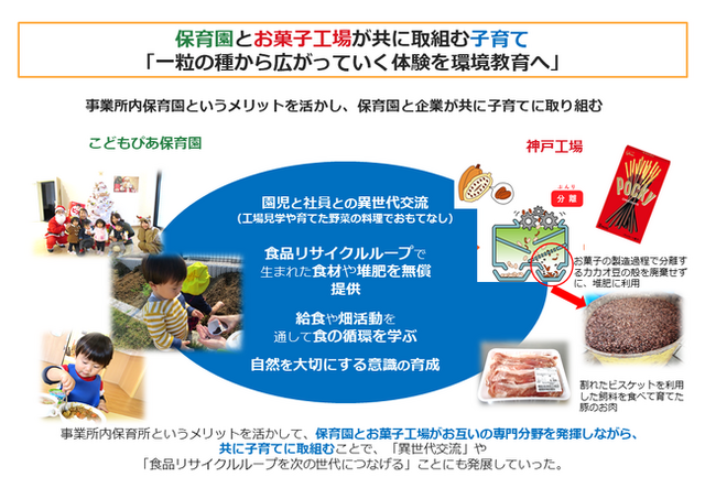 園児と社員の交流のみならず、保育園の畑仕事や食育を、乳幼児期からの「環境教育」へと意識を変えてくれたのが、食品リサイクルループに取り組むお菓子工場「神戸工場」です。お菓子の製造過程で出る割れたビスケットやカカオ豆の殻などを、養豚の飼料や堆肥に利用し、その豚肉を園の給食の食材に、堆肥は子どもたちの畑仕事に無償提供。大好きなお菓子に使われているカカオ豆の堆肥を使って野菜を育て、自分たちで調理し、食べることで、子どもたちは食品リサイクルを体験的に学ぶことができるようになりました。