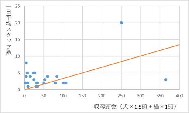 現在の犬猫の収容数と、1日の平均スタッフ数に関しては、以下の散布図の通りであった。尚、犬と猫では、スタッフ1人当たりの上限が異なる(犬は上限20頭、猫は上限30頭)ため、収容数=犬の頭数×1.5頭+猫頭数として計算した。