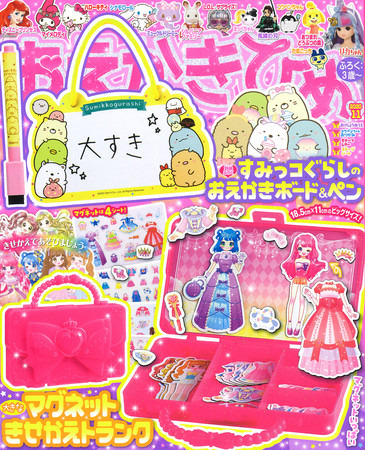 11月号は「すみっコぐらしのおえかきボード&ペン」と「大きなマグネットきせかえトランク」の超豪華2大付録。おえかきボードは、すみっコたちが大集合のかわいいデザインで、おえかきやメッセージ、簡単なゲームなどが何度も楽しめます。