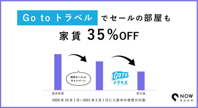 初期費用0円、5秒で家が見つかるアプリNOW ROOMを提供している株式会社NOW ROOM(本社:東京都渋谷区、代表取締役:千葉史生)は、2020年10月1日(木)から2021年2月1日(月)の期間にご入居されている方を対象に、「Go Toトラベル」の活用でNOW ROOM掲載物件の家賃が35%OFFになるキャンペーンを実施します。これにより、NOW ROOMに掲載しているホテル・ゲストハウス・民泊の部屋について、自動直前セールやその他キャンペーン価格よりさらに35%OFFで滞在いただけます。