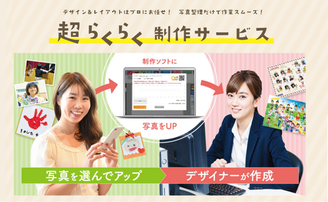 特設サイト「アルバムレスキュー相談室」の中で実施している「超らくらく制作サービス」は、「忙しくて時間が取れない」「今からではもう間に合わない」とアルバム制作を諦めていた先生方やアルバム委員の方々を支援するサービスです。写真を選定して専用ソフトにアップロードして、簡単な指示用紙に記入するだけで、当社のアルバムデザイナーがベースとなるアルバムのデザインを作成。その後、お客様自身がソフトを使ってデザインを自由にアレンジすることも可能です。制作費は通常¥3000/2Pのところを半額で受け付けています(印刷費は通常料金)。