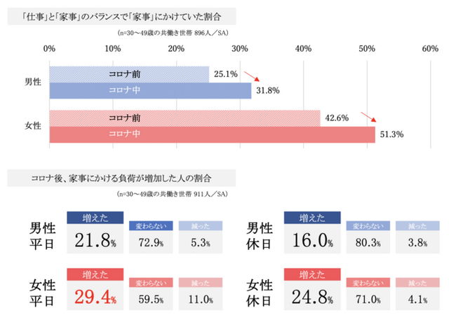 また、30~40代の共働き世帯では「コロナ前と比べコロナ後は家事負荷が増加した」と回答した女性が男性を上回っており、とくに平日は3割近くの女性が負担増を感じていました。