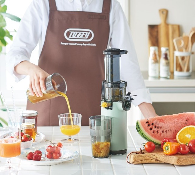 おうちで食事をとることが多く健康志向が高まっている今にぴったりな「Toffy ミニスロージューサー」は、縦36cm×横12.4cmと従来の市販品に比べてとってもコンパクト。小型で軽く、出し入れもしやすいため毎日使い続けられます。石臼式の低速スクリューでゆっくり圧搾することで、高速のミキサーと比べて野菜や果物に含まれるビタミンなどの栄養素が壊れにくく、食材のポテンシャルを最大限に引き出すことができます。また稼動時に食材が空気に触れにくく、酸化や泡立ちも抑えられ鮮度とおいしさをキープします。