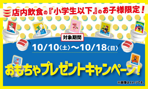 コロワイドグループのかっぱ寿司(カッパ・クリエイト(株) 本社:神奈川県横浜市 代表取締役社長 小澤俊治)は、2020年10月10日(土)~10月18日(日)の期間、小学6年生以下のお子様を対象におもちゃプレゼントキャンペーンを実施いたします。