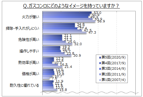 ガスコンロのイメージは(複数回答)、「火力が強い」が53.0%、「掃除・手入れがしにくい」が34.8%、「危険性が高い」「操作しやすい」が2割前後です。女性では「掃除・手入れがしにくい」、IHクッキングヒーター利用者では「危険性が高い」の比率が高くなっています。