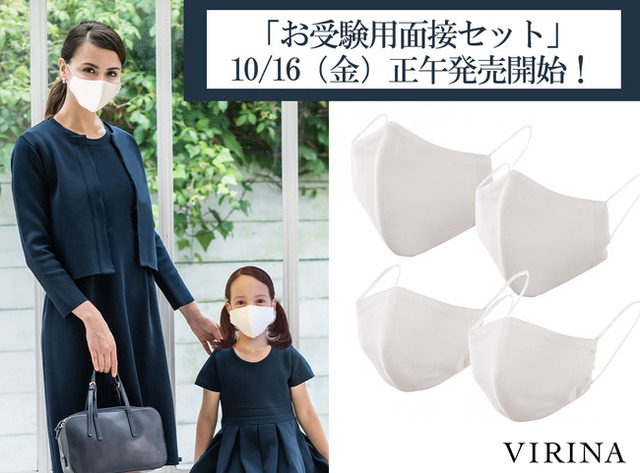 ヴィリーナ ジャパン(株)(東京都港区/代表取締役 青木愛/http://www.virinamaternity.com)は、コロナ禍でマスクを着けたまま面接と考査を実施する私学、国立小学校が多い事情に着目。お受験本番に必要な枚数を揃えたマスクセットを作り、「お受験用ファミリーセット」「お受験用、お母様&お子様セット」のキャンペーンを10/16(金)正午~開始します。
