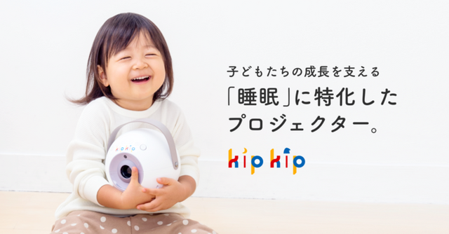 子どもの大人とともに睡眠時間が世界でワースト1位といわれている日本は、長年多くの子育て家庭が寝かしつけや睡眠に対しての悩みを抱えてきました。睡眠導入の際は日常的に起こっている脳への刺激を落ち着かせ、リラックスした状態に仕上げてから睡眠に入ることで、より睡眠の質をあげるといわれています(医学博士の古賀良彦先生による)。そのような社会課題を解決すべく、kipkipは全国の“寝かしつけや睡眠”に悩む子育てしている家族に向けてサポートするおやすみプロジェクターを開発しました。おやすみプロジェクターは、寝室という眠りの準備を行う空間で、知育や情操教育も期待できる絵本を天井や壁に投影し、睡眠導入の質を向上できる商品です。