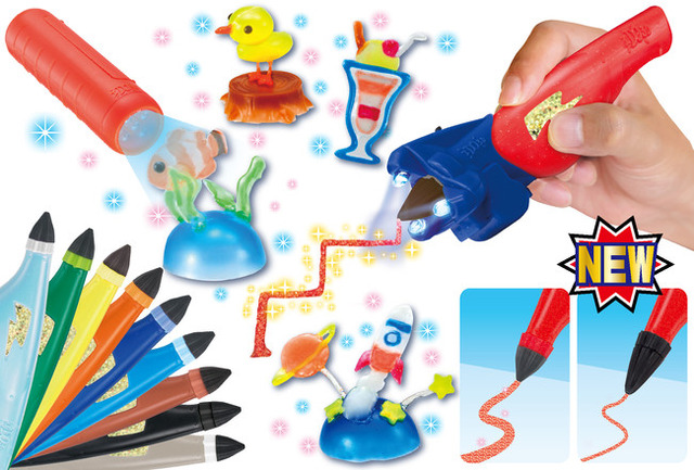 「3Dドリームアーツペン」シリーズは、ジェル状のインクを可視光線のライトで固めて立体物を作ることができる不思議なペンで、熱を使わない為お子様でも安全に遊べます。