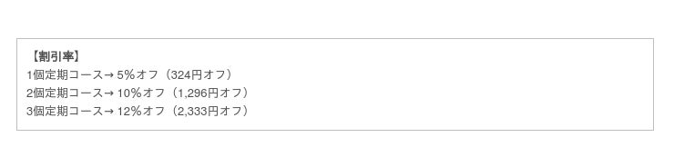 定期購入は1個から可能となりますが、2個定期コースまたは3個定期コースが断然お得です。まとめてご購入いただくほど割引率がアップし、お客様にとってもメリットの大きい仕組みといたしました。