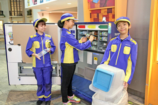 ◇体験内容:自動販売機の仕組みを学び、キッザニアの街にある自動販売機の販売計画に基づき、商品の入れ替えや補充、サンプルディスプレイやポスターの切り替えを行います。さらに、ペットボトルのリサイクルの仕組みと、分別の大切さを学ぶことができます。