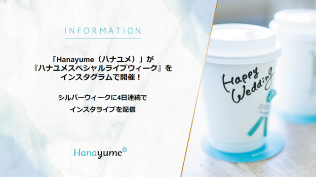 株式会社エイチームのグループ会社である株式会社エイチームブライズ(本社:愛知県名古屋市、代表取締役社長:大崎恵理子)は、9月19日(土)から9月22日(火)のシルバーウィーク期間中に、Instagramライブ配信イベント「ハナユメスペシャルライブウィーク」を開催しました。