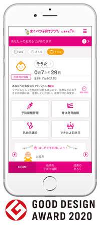 幕別町に採用された『まくべつ子育てアプリ』は、スマートフォン・タブレット端末・PCに対応したサービスで、妊産婦と子どもの健康データの記録・管理や予防接種のスケジュール管理、出産・育児に関するアドバイスの提供、離れた地域に住む祖父母など家族との共有機能や、町が配信する地域の情報をお知らせするなど、育児や仕事に忙しい母親や父親を助けてくれる便利な機能が充実しています。育児日記として使用できる「できたよ記念日」は、厚生労働省の母子健康手帳様式例などを元に作成し、子育ての思い出を残すだけではなく、子どもの成長・発達の目安としての役割も備えています。