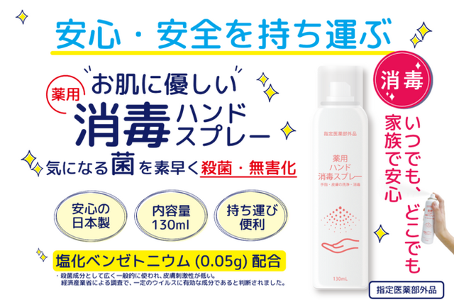 サムライワークス株式会社(代表取締役:新島 実 本社所在地:東京都渋谷区)は、いまだ衰えることのないこのコロナ禍の中、少しでも感染のリスクを軽減できればという思いと、一刻も早い終息を願い、「薬用ハンド消毒スプレー」のキャンペーン価格の1箱5本入りを1,900円(税抜)1本あたり380円での販売を開始致します。