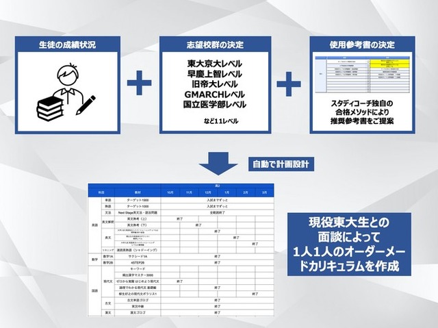 これによって生徒の学習カリキュラムを自動で決定し、それをもとに現役東大生が個別のニーズに合わせて勉強計画についてコーチングを行う体制が導入されたこととなります。