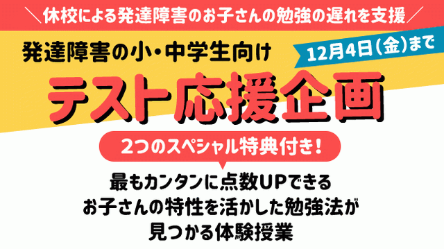 家庭教師のあすなろ(株式会社ひのき 代表取締役:井上智嗣)では、新型コロナウイルスの影響で学校の授業に遅れを感じている発達障がいの小・中学生を対象にテスト応援企画(12月4日金曜まで)として、最もカンタンに点数UPできる『お子さんの特性を活かした勉強法』が見つかる体験授業を開催。