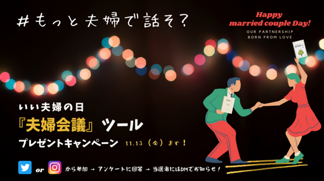 「わたしたち」を主語に、より良い未来に向けて夫婦で対話を重ね、行動を決めていく『夫婦会議』。夫婦のパートナーシップを育む『夫婦会議』のツールやサービスを展開するLogista株式会社(福岡県福岡市、共同代表 長廣百合子(妻)、長廣遥(夫))は、いい夫婦の日に向けて、コロナ禍の『夫婦会議』の実態調査を兼ねたプレゼントキャンペーンを開始しました。(キャンペーン特設サイト: https://www.logista.jp/cp201122/ )