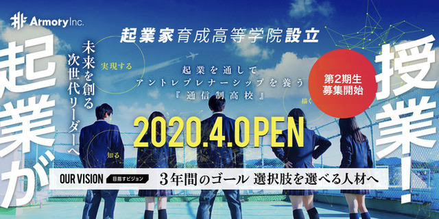 株式会社Armory(本社:大阪府大阪市 代表取締役社長:福永祐作)は2020年4月より、代々木高等学校(https://yoyogi.ed.jp/)と業務提携して、起業家育成高等学院を開校しました。