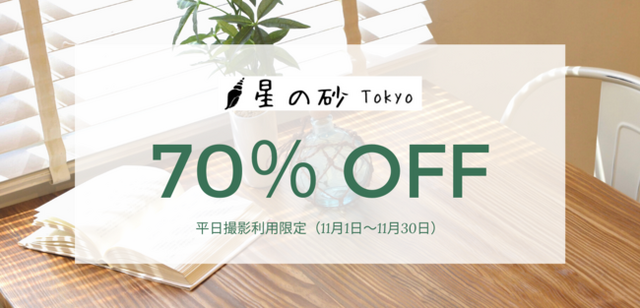 撮影利用の方はHPからの予約で通常料金から70%OFFに!