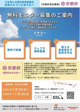 京都府では、ご自宅の太陽光発電設備を長く・安全にご使用いただくための今後の政策に活用させていただくことを目的に、住宅用太陽光発電設備を対象とした健全性調査を実施します。調査に当たり、2014 年3 月以前に設置された住宅用太陽光発電設備の所有者をモニターとして募集し、無償で簡易点検を実施いたします。メーカー保証の終了や、機器寿命が近づいている今こそ点検のタイミングです。この機会にぜひ、モニター登録をご検討下さい。