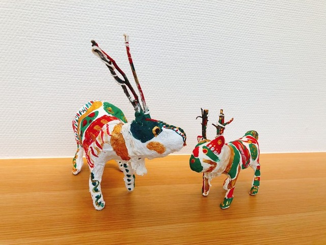 新聞紙や針金でトナカイの動きを作り、角は枝を使ってユニークに表現します。