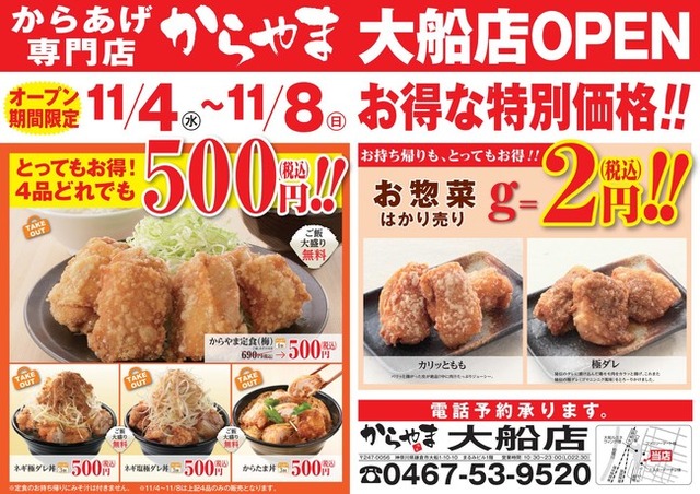 からあげ専門店「からやま」などを運営するエバーアクション株式会社(本社:東京都千代田区/代表:坂本 守孝)は、からあげ専門店「からやま」を11月4日(水)神奈川県鎌倉市にオープンします。開店を記念して11月4日(水)~11月8日(日)はとってもお得な特別価格で営業します。
