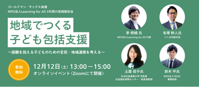 「子どもの貧困」という社会課題の解決に取り組む「NPO法人Learning for All (以下、LFA)」は、「地域の子ども支援の在り方」についてゲストと共に考えるオンラインイベントを12月12日(土)に開催することを決定しました。