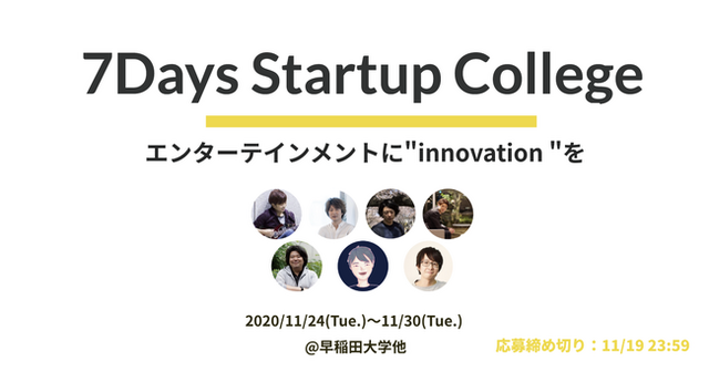 エンターテインメント・スタートアップ・スタジオのStudio ENTRE株式会社(本社:渋谷区東、代表取締役 山口哲一、以下ENTRE)は学生起業サークル「Wit」と共同で、大学生に向けたエンターテインメント領域のインキュベーションプログラム「7days Startup College」を11/24~11/30の7日間に渡り開催致します。