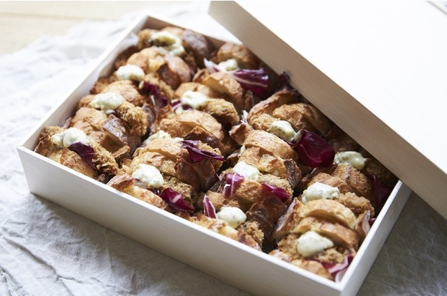 おうちごはんも敢えて箱に詰め、蓋を開けるワクワク感を!牡蠣フライにハード系のパンを合わせサンドイッチに。詰め方とトレビスの使い方が、チオベンさんらしさ。