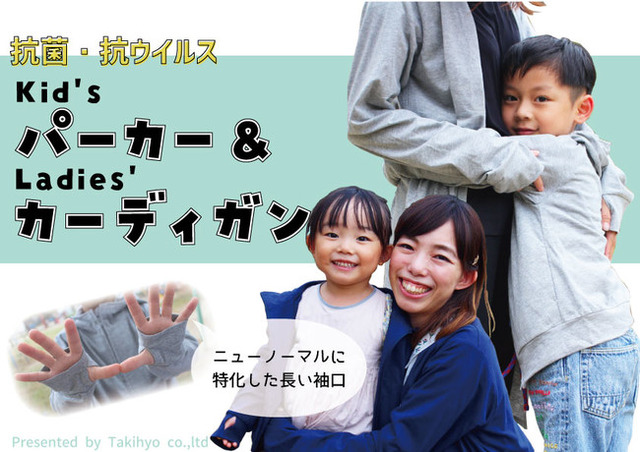 タキヒヨー株式会社(本社:名古屋市西区、代表取締役 社長執行役員:滝 一夫)は、クラウドファンディングプロジェクト第2弾として株式会社CAMPFIRE(本社:東京都渋谷区、代表取締役:家入 一真)が運営するクラウドファンディングサイト「CAMPFIRE」にて2020年11月5日(木)9時より、抗菌・抗ウイルス素材でニューノーマルの生活にぴったりの、親子で着られるキッズパーカー&レディスカーディガンの支援募集を開始いたしました。