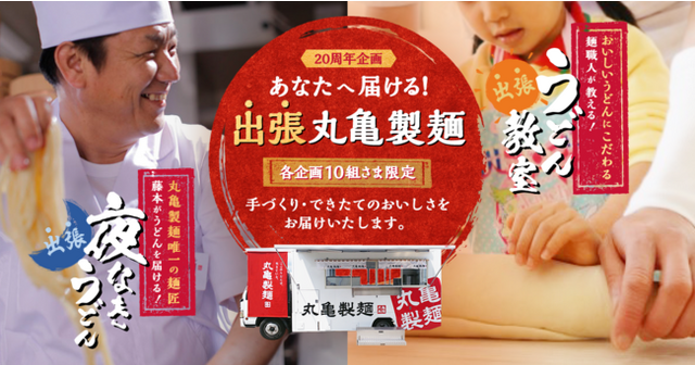 株式会社丸亀製麺(本社:兵庫県神戸市、代表取締役社長:山口 寛)が展開する讃岐うどん専門店「丸亀製麺」は、20周年企画として2020年10月8日(木)から10月20日(火)の間、『あなたへ届ける!出張 丸亀製麺』キャンペーンの募集受付を実施しておりました。本キャンペーンは、丸亀製麺唯一の麺匠、藤本が打つ本格的なうどんを麺匠自らがお客さまのもとへお届けする『出張 夜なきうどん』と、麺職人がご自宅に伺い、お子さまと一緒に粉から打つうどん作り体験ができる『出張 うどん教室』の2本立てとなっております。