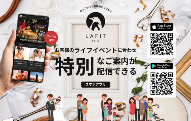 国内シェアNo.1の婚礼準備システム「ONE-W(ワン-ダブリュー)」を展開するPIEM(パイエム)株式会社(本社:福岡県福岡市、代表取締役:森本厚彦)は、エンドユーザーと、その家族・親族等のライフイベントに着目し、人生のライフステージ、季節イベントに応じて登録企業・施設が情報配信できるアプリ「LAFIT(ラフィット)」を、本年度の家族週間スタートとなる8日(日)を直前にした、本日11月6日(金)に“iTunes Store”・“Playストア”にて、リリース致しました。合わせて、初期導入費0円、利用料3カ月無料となる新規導入キャンペーンをスタート致します。