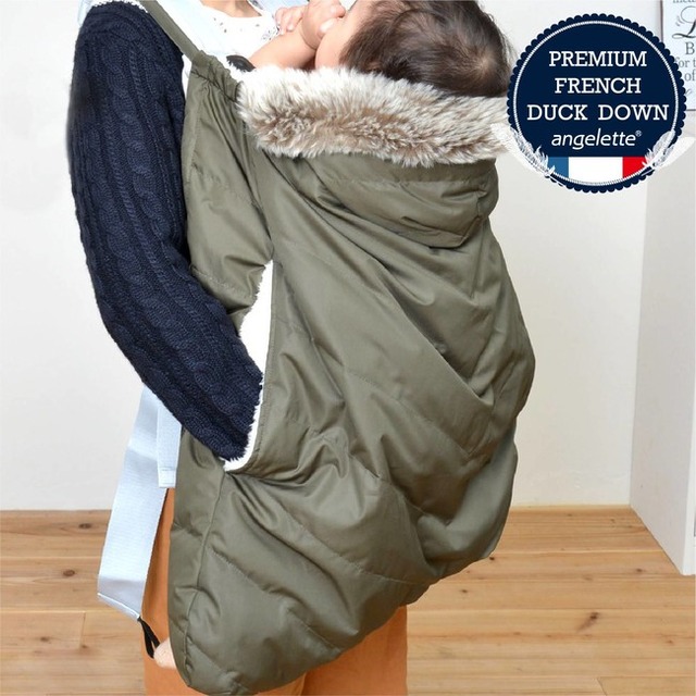 高級フレンチダウンを使用した軽くて暖かい、ファッション性の高い防寒ケープです。抱っこひもにも、ベビーカーにも使える便利な2way仕様です。(ネイビー・カーキの2色展開)