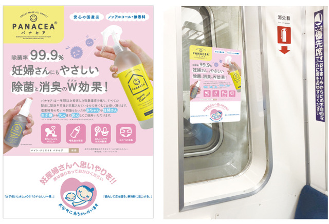 株式会社パイン・クリエイトは、妊産婦さんにも優しい、除菌と消臭のW効果を発揮する空間洗浄ミスト【PANACEA(R)パナセア 】をマタニティマークとのタイアップで、都営地下鉄大江戸線の優先席エリアにて期間一年の広告を開始しました。