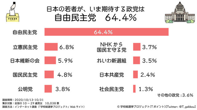 その結果、「期待する政党」については、6割を超える若者が「自由民主党」(64.4%)を選択し、理由として「いつも与党で安定しているし、今まで通りでいい」「菅総理に期待している」「他の政党よりはマシだと思う」との声が挙がりました。続いて「立憲民主党」(6.8%)、「日本維新の会」(5.9%)、「国民民主党」(4.8%)、「公明党」(3.8%)、「NHKから国民を守る党」(3.7%)、「れいわ新選組」(3.5%)、「日本共産党」(2.4%)、「社会民主党」(1.3%)となり、「その他の政党」は 3.6%との結果となりました。