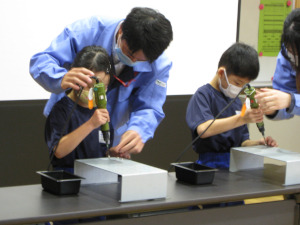 当日は、OSCの若手社員を中心とするメンバー5名が同校を訪問し、多目的ルームに集まった3年生126名に、レーザー加工や電源製造など、OSCが行っている「モノづくり」の様子を動画で紹介しながら、クイズを交えて分かりやすく説明しました。また、動画に出てきたモノづくりの実体験として、子どもたち全員が電動ドライバーによるネジ締めにチャレンジしました。