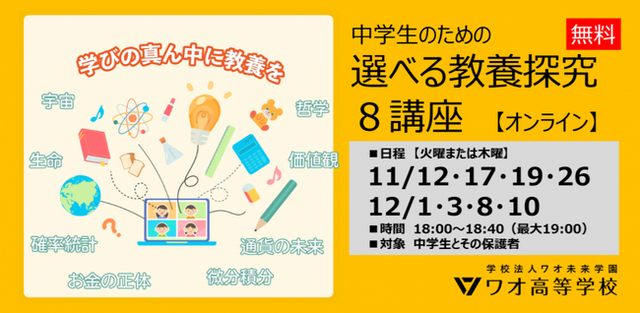 ワオ高等学校は、2021年4月に開校する最新のオンラインハイスクールとして、近未来に対応した最新の教育「中学生のための選べる教養探究8講座」を2020年11月12・17・19・26日、12月1・3・8・10日にオンラインにて公開授業として開催致します。