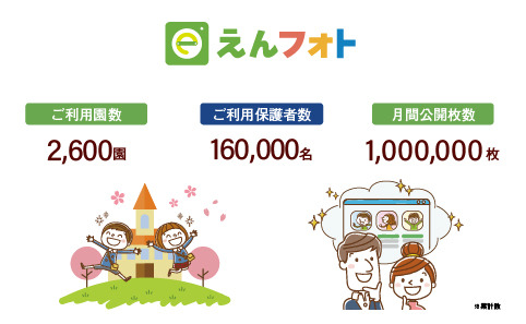 また、2014年10月のサービス開始以降、「えんフォト」のご利用園数が2,600園(※2)を、ご利用保護者さま数が160,000名(※2)を、それぞれ突破したことも併せてお知らせします。