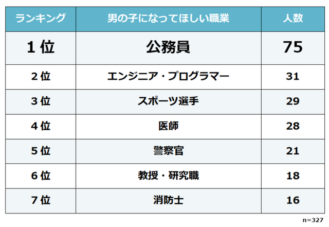 男の子になってほしい職業には、公務員を筆頭に、医師、警察官、消防士など、収入が安定していて、かつ失業リスクの少ない仕事がランクインしました。